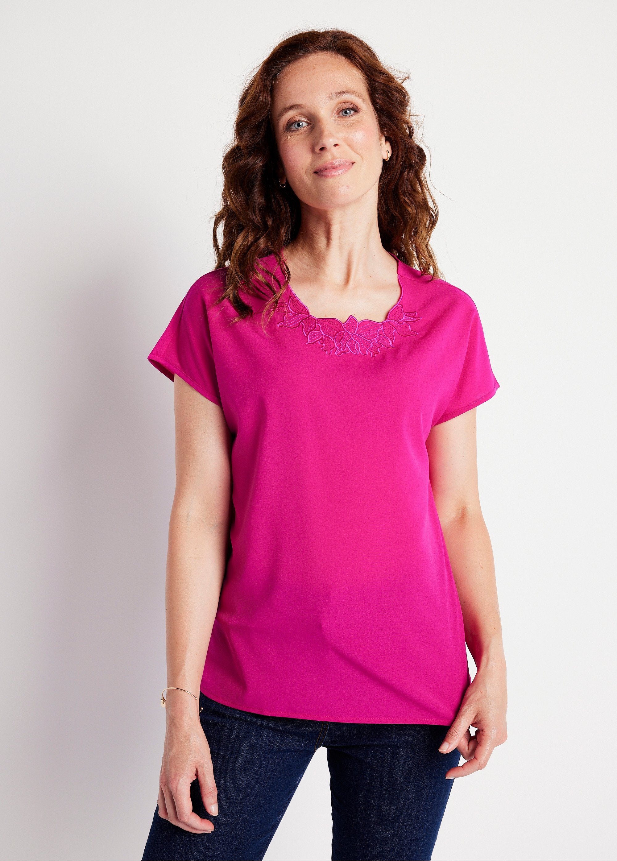 Long_short-sleeved_top_with_round_neck_embroidery_Fuchsia_FA1_slim Long_short-sleeved_top_with_round_neck_embroidery_Fuchsia_FA2_slim