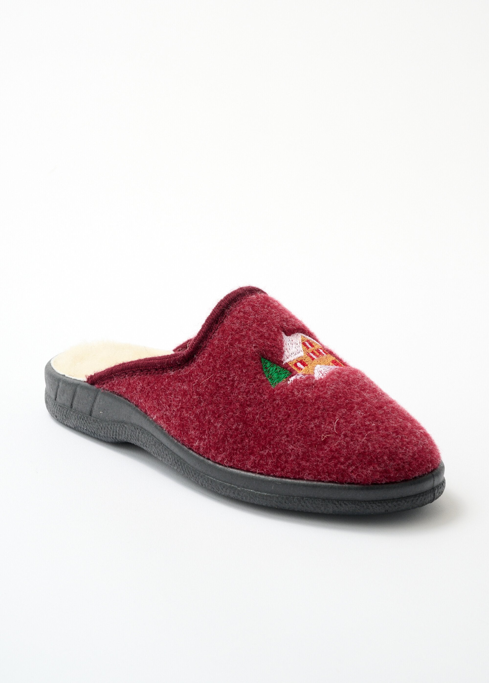 Warm and well-fitting, the mule offers cozy comfort. Spacious fit, comfortable width. Embroidery placed on the top. Bias finish.