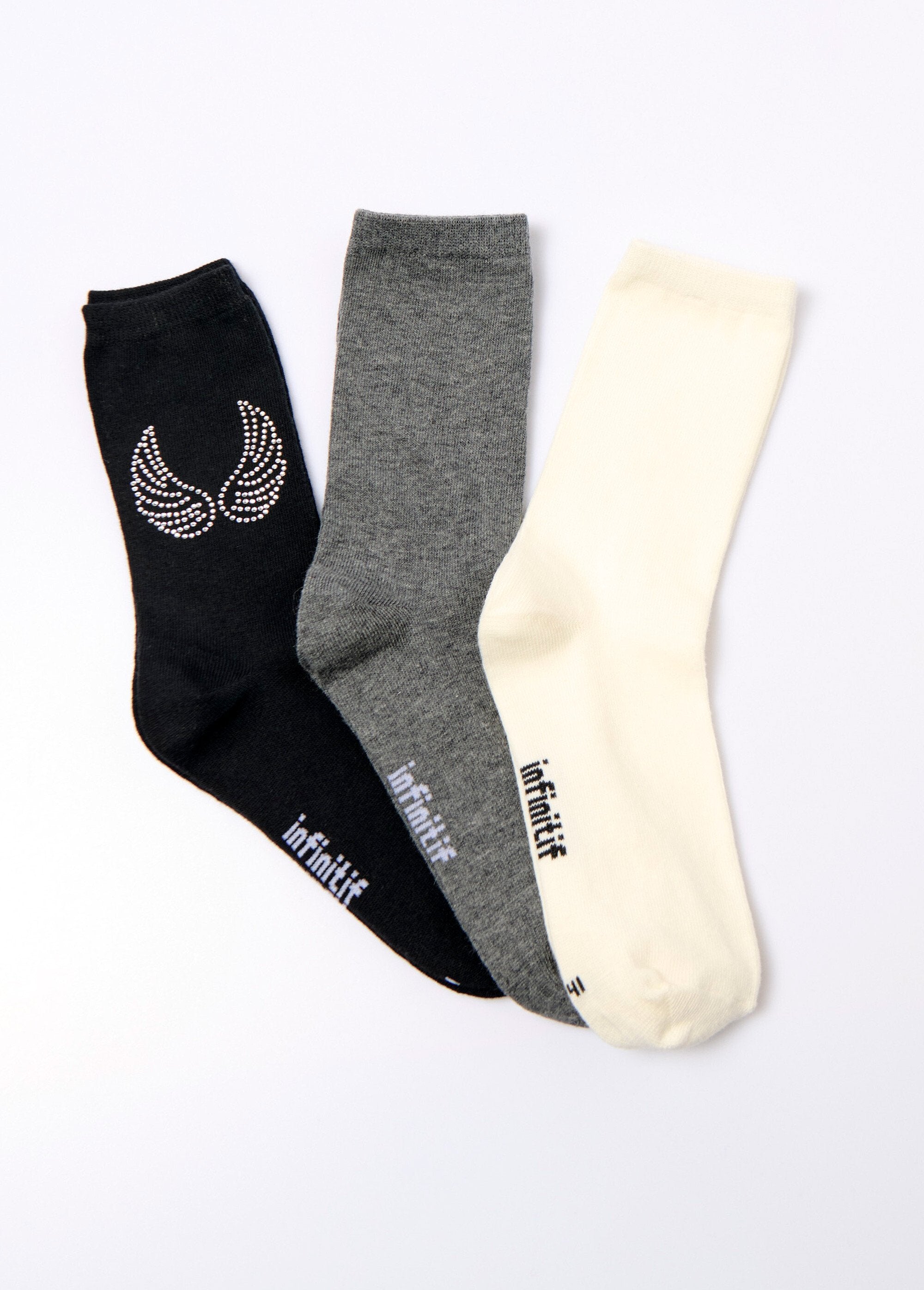 This pack of 3 Infinitif® socks combines originality and practicality. One pair features an elegant rhinestone angel wing motif, adding a subtle touch of shine, while the other two are basic and essential, perfect for complementing any outfit. These socks combine comfort and style, offering a versatile solution for every occasion, from everyday to festive occasions.